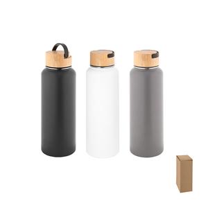Descrição: Garrafa em aço inox (90% reciclado) de parede dupla térmica, isolada a vácuo. Parede com revestimento em pó oferecendo mais durabilidade e resistência. Tampa em bambu com pega em plástico que facilita o transporte. Grande capacidade até 1.2 L.