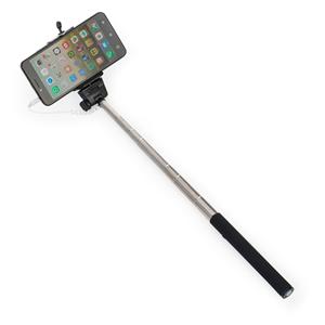 Descrição: Bastão de selfie alumínio com detalhe emborrachado preto. Possui suporte plástico regulável, válvula lateral do bastão para ajuste de posicionamento e válula central para apertar o suporte. Suporte ajusta até 8,4cm de largura para encaixar celu