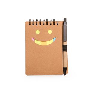 Descrição: Bloco de anotações ecológico com caneta de papelão. Possui detalhe “smile” na capa frontal(verso liso), caneta ecológica com acabamentos em plástico acionada por clique, primeira folha(branca) com cinco blocos autoadesivos coloridos com aproxim