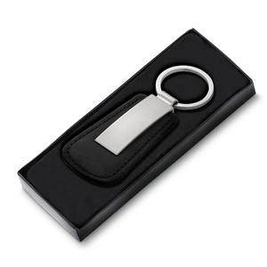 Descrição: Chaveiro de metal brilhante com detalhe de couro sintético, frente lisa e verso com um parafuso.