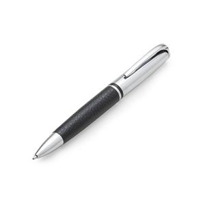 Descrição: Caneta metálica com detalhe em couro sintético, carga esferográfica azul e acionamento por rotação.