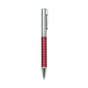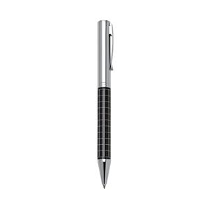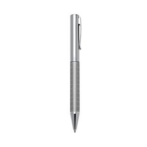 Descrição: Caneta metálica com carga esferográfica azul e acionamento por rotação.