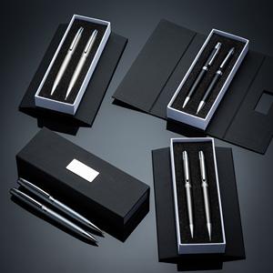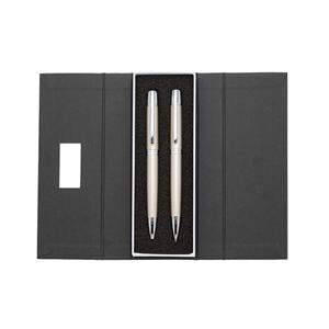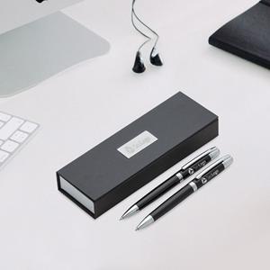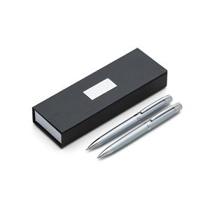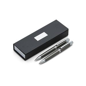Descrição: Conjunto caneta e lapiseira em estojo de cartonagem com placa central para personalização. Clip metal com dois anéis em relevo, anel centralizado e dois anéis em relevo na ponteira e acionam por giro. Estojo revestida com espuma na parte intern