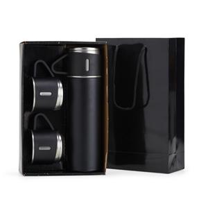 Descrição: Kit garrafa térmica 450ml com duas tampas extras que podem ser utilizadas como xícaras. Garrafa produzida em inox com base antiderrapante e tampas de inox com revestimento plástico. Acompanha sacola de papel com berço de papelão para acomodação
