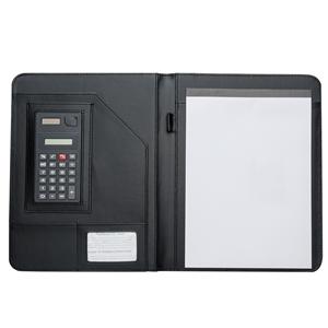Descrição: Pasta convenção de couro sintético, possui calculadora solar plástica de 8 dígitos, suporte para cartão, suporte com visor para cartão de identificação, suporte para arquivar documentos, suporte para caneta(não acompanha caneta) e bloco com 20