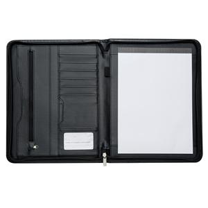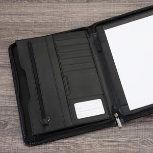 Descrição: Pasta convenção de couro sintético com zíper, possui 2 compartimentos grandes para arquivar documentos, compartimento interno com zíper, 7 divisórias pequenas para documentos, suporte com visor para cartão de identificação, suporte para caneta(