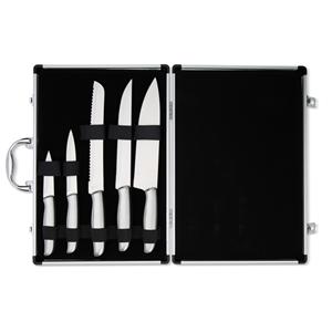 Descrição: A solução ideal para quem valoriza qualidade nos cortes e organização na cozinha. O kit inclui 5 facas em aço inoxidável, com diferentes tamanhos, perfeitas para uma experiência gourmet. Acompanha uma maleta de alumínio texturizado, com interio