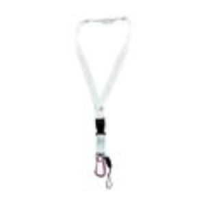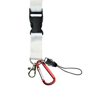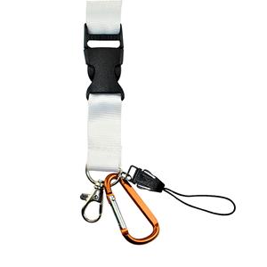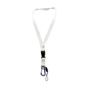 Descrição: Cordão de Pescoço Branco com Mosquetão Azul e suporte de Celular para Sublimação - Tamanho 2 x 53cm