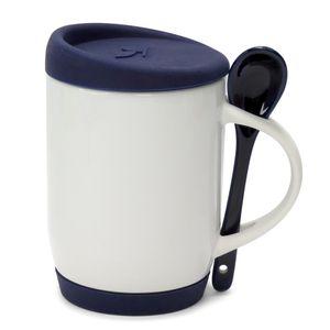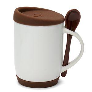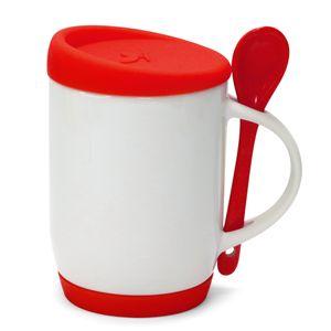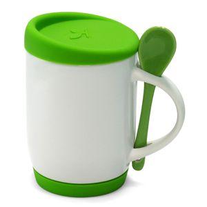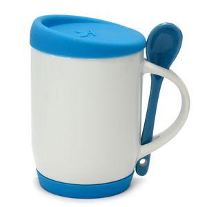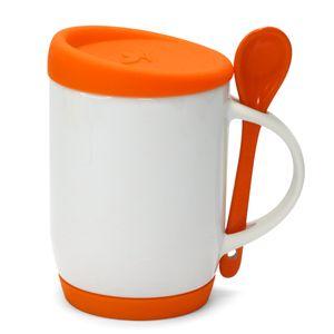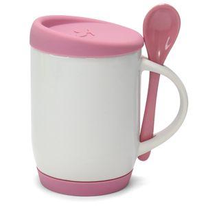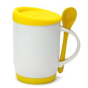 Descrição: Caneca para Sublimação de Cerâmica Branca com Colher Alça Soft e Tampa Base em Silicone - Amarela