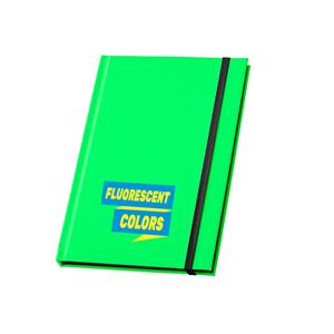 Descrição: Caderno A5 com capa dura em PU fluorescente. Contém 96 folhas pautadas brancas com a borda em preto, fita separadora e elástico. 140 x 210 mm
