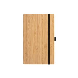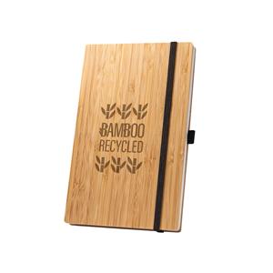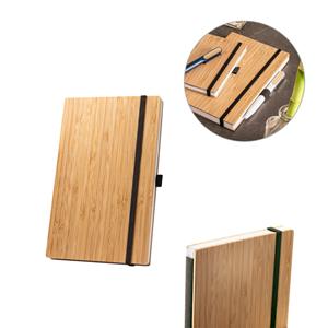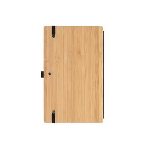 Descrição: Caderno de bolso de capa e contracapa em placa de bambu e lombada em poliéster 100% reciclado (100% rPET). O interior contém 80 folhas lisas com papel reciclado, suporte para esferográfica (não inclusa) e elástico para fecho do caderno. A cor e