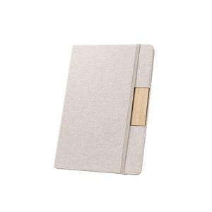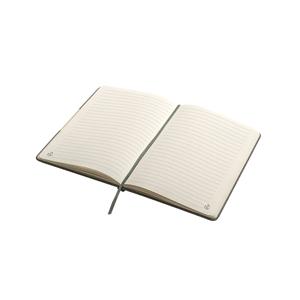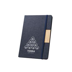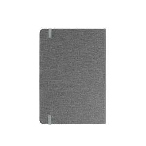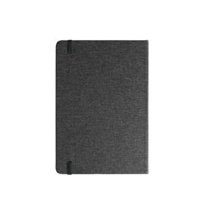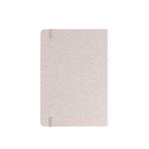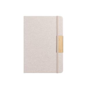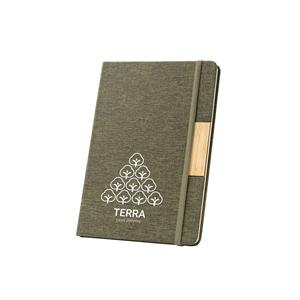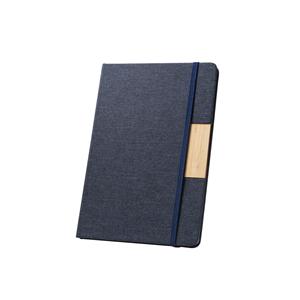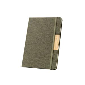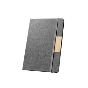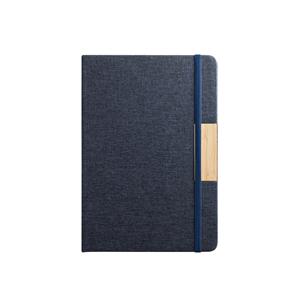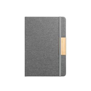 Descrição: Caderno A5 de capa dura em tecido poliéster 100% reciclado (100% rPET) e detalhe em bambu. O interior contém 80 folhas pautadas em papel cor marfim reciclado, fita separadora e elástico para fecho do caderno. A cor e o resultado da impressão no