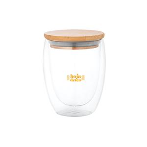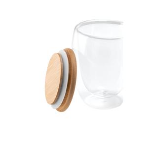 Descrição: Copo em vidro isotérmico (borossilicato), térmico com parede dupla isolada a ar e tampa em bambu. Copo com capacidade até 350 mL, ideal para líquidos frios ou quentes, tendo uma tampa com isolante em silicone que facilita o transporte do copo e