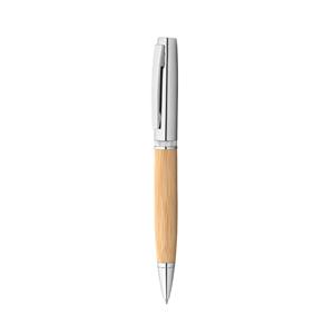 Descrição: Esferográfica em bambu e metal oferecida em estojo de bambu e ABS com acabamento cromado. Escrita em preto. Fornecido em caixa presente de papel kraft reciclado. A cor e o resultado da impressão nos materiais naturais pode variar entre produtos