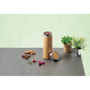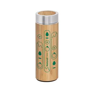 Descrição: Garrafa em aço inox e bambu de parede dupla térmica, isolada a vácuo. Com tampa em aço inox com detalhe em bambu. Infusor de chá no interior incluso. Capacidade até 430 mL. Preserva as bebidas quentes por 8 horas e as bebidas frias por 12 horas