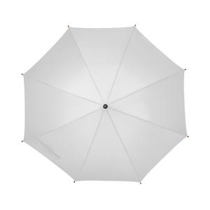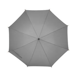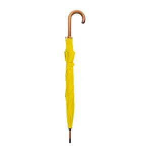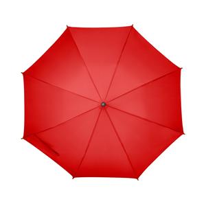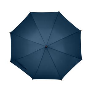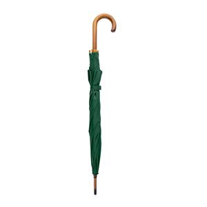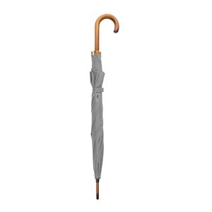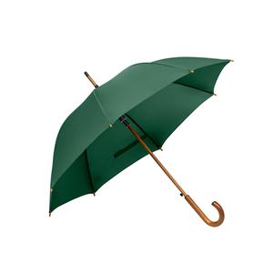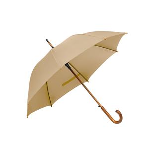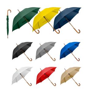 Descrição: Guarda-chuva em poliéster pongee 190T, com abertura automática. Varetas em fibra de vidro, com pega e haste em madeira.
