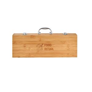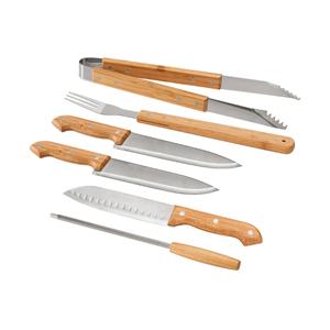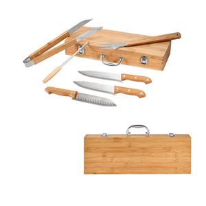 Descrição: Kit churrasco em estojo de bambu. Composto por 6 peças em aço inox e bambu: faca chefe, faca média, faca japonesa, pinça, garfo e afiador. Certificação EU Food Grade. A cor e o resultado da impressão nos materiais naturais pode variar entre pro