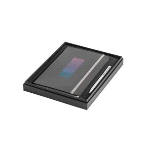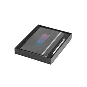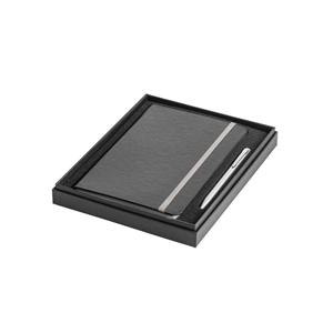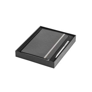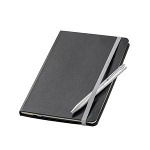 Descrição: Conjunto esferográfica e caderno A5. A esferográfica é em alumínio com clipe de ferro e é de mecanismo twist com escrita a azul. O caderno A5 de capa dura com 80 folhas pautadas de cor marfim, fita separadora, elástico e bolso interior. Conjunt