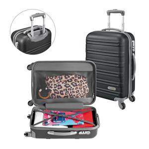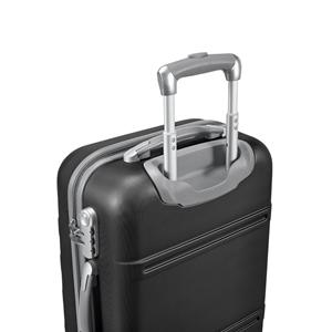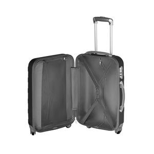 Descrição: Mala de viagem executivo em ABS com interior forrado, com divisória. Fecho de segurança com senha na lateral, 4 rodas giratórias, pega extensível em alumínio, com mola (altura da pega estendida até 435 mm) e placa metálica removível, para fácil
