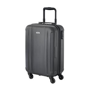 Descrição: Mala de viagem executivo em ABS com interior forrado, com divisória. Fecho de segurança com senha na lateral, 4 rodas giratórias, pega extensível em alumínio, com mola (altura da pega estendida até 500 mm), e placa metálica removível com imã pa