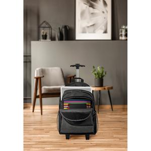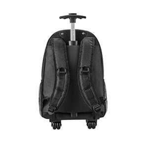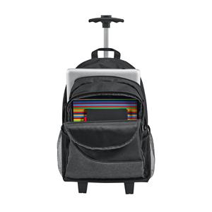 Descrição: Mochila trolley para notebook em 300D com 2 rodas duplas. Compartimento principal forrado e almofadado, com divisória para notebook até 15.6''. A trolley tem 2 bolsos laterais em tela, protetor de rodas, alças almofadadas e pega extensível em a