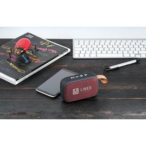 Descrição: Caixa de som portátil com microfone, em ABS, tecido em poliéster e acabamento emborrachado. Transmissão sem fios BT v5.0, ligação stereo 3,5 mm e leitor de cartões microSD. Potência de 3W/4Ω,