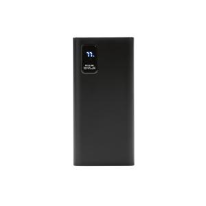Descrição: Bateria portátil em ABS 100% reciclado. Bateria em lítio com capacidade de 30.000 mAh e tempo de vida ≥ 300 ciclos. Possui entrada micro-USB e USB-C, 4 saídas USB-A e uma saída USB-C. A parte frontal tem uma tela de LED com informações do nível