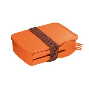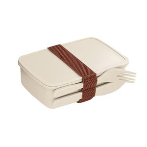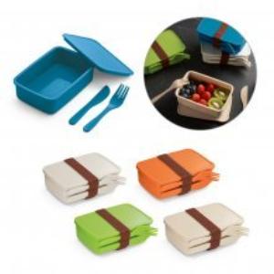Descrição: Marmita hermética em fibra de bambu (60%) e PP (40%) com compartimento com capacidade até 600 mL. Contém banda elástica com suporte para 2 talheres, inclusos: garfo e faca. Apto para micro- ondas (retirar a tampa). Certificação EU Food Grade.