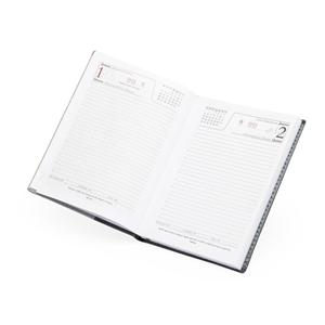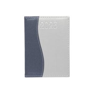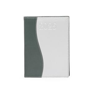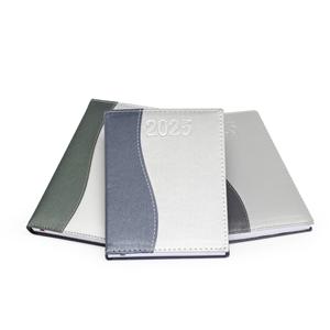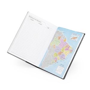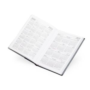 Descrição: Agenda diária 2025 de couro sintético. Contém fita de cetim marca página, dados pessoais, calendário de 2024 à 2026, mapa do Brasil, mapa-múndi, índice telefônico e planejamento.