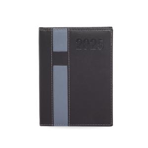 Descrição: Agenda diária 2025 de couro sintético com suporte para caneta. Contém fita de cetim marca página, dados pessoais, calendário de 2024 à 2026, mapa do Brasil, mapa-múndi, índice telefônico e planejamento.