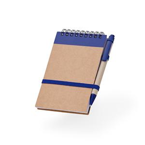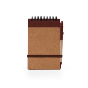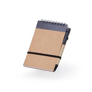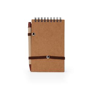 Descrição: Bloco de anotações ecológico com caneta, feito em kraft com detalhe plástico. Contém aproximadamente 70 folhas brancas com pauta, Porta-Caneta elástico, elástico para lacre e acompanha caneta de papelão com detalhes plásticos, carga esferográfi