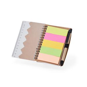Descrição: Bloco de anotações ecológico com autoadesivos, régua e caneta, feito em kraft. Contém folha com régua 13 cm, cinco autoadesivos com aproximadamente 13 folhas, bloco com aproximadamente 69 folhas brancas com pauta, Porta-Caneta elástico e acompa