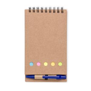 Descrição: Bloco de anotações kraft com wire-o. Contém cinco blocos coloridos autoadesivos com aproximadamente 25 folhas, bloco amarelo autoadesivo com aproximadamente 25 folhas e bloco de folhas brancas pautadas com aproximadamente 70 folhas. Acompanha m