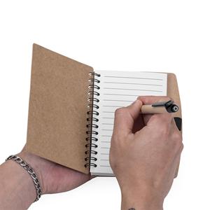 Descrição: Bloco de anotações ecológico com caneta. Possui espiral preto lateral e capa lisa frente e verso, aproximadamente 70 folhas brancas pautadas e última folha papelão branco. Possui suporte elástico com caneta papelão de clip e ponteira plástica.
