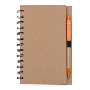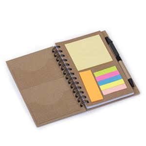 Descrição: Bloco de anotações ecológico com caneta e autoadesivos. Bloco com dois suporte internos para cartão, possui cinco blocos autoadesivos com 20 folhas cada, bloco laranja e bloco amarelo com aproximadamente 20 folhas cada. Possui aproximadamente 7
