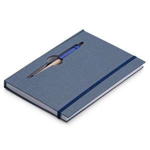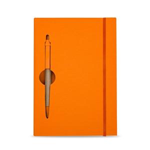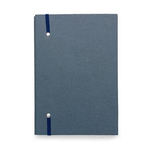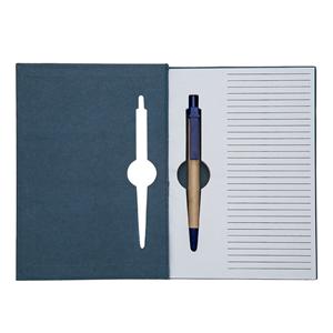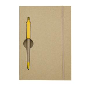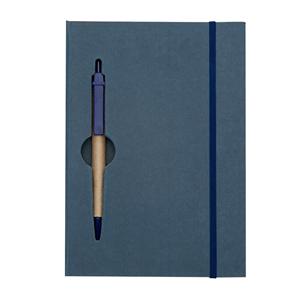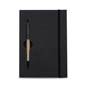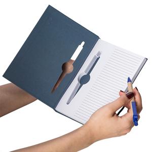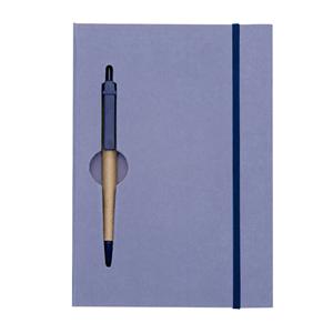 Descrição: Bloco de anotações ecológico com capa e miolo vazados, utilizados como suporte para a caneta. Bloco com miolo de picote, elástico para lacre e caneta de papelão com detalhes plásticos, carga esferográfica na cor azul e acionamento por clique.