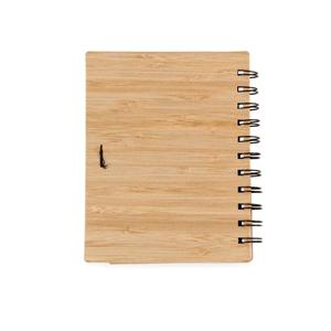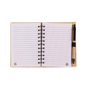 Descrição: Bloco de anotações ecológico com caneta. Capa de papelão com folha de bambu e uma faixa preta no lado esquerdo da capa e verso liso. Possui aproximadamente 70 folhas brancas pautadas com logo reciclado na lateral inferior. Acompanha suporte elá