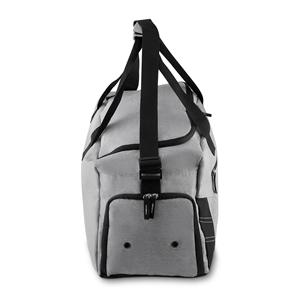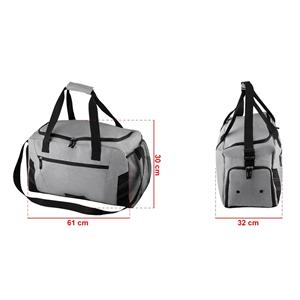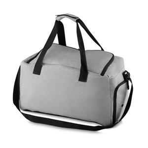 Descrição: Bolsa esportiva de poliéster. Possui bolso frontal, bolso lateral de malha, bolso lateral com zíper para calçados e bolso grande superior. Alça de mão com pegador cinza de velcro e alça ajustável para as costas.Medidas aproximadas para gra