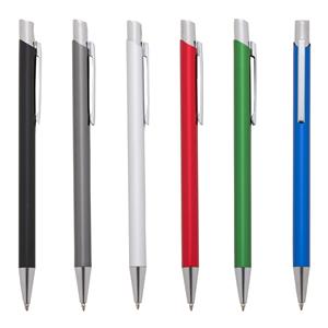 Descrição: Caneta metálica com carga esferográfica azul e acionamento por clique.