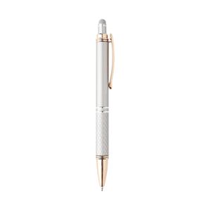 Descrição: Caneta metálica touchscreen com parte inferior texturizada, acionamento por clique e carga esferográfica azul 1.0mm.