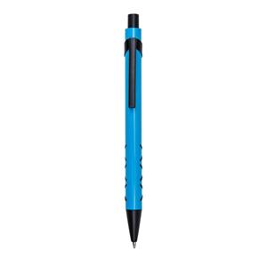 Descrição: Caneta metálica com detalhe emborrachado, carga esferográfica azul e acionamento por clique.