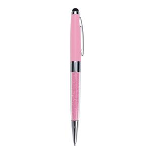 Descrição: Caneta metálica com touch screen e detalhes em cristal, carga esferográfica azul e acionamento por rotação.