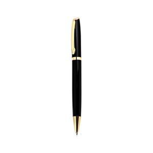 Descrição: Caneta metal com detalhes em dourado. Clip metálico com anel dourado abaixo, esferográfica aciona por giro.