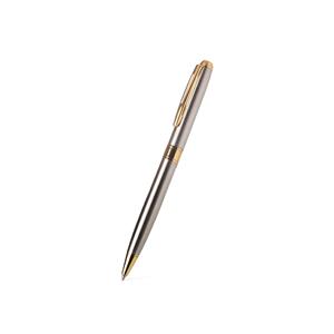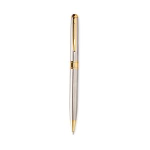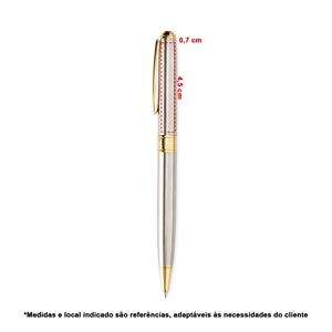 Descrição: Caneta metálica com carga esferográfica azul e acionamento por rotação.