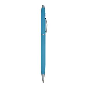 Descrição: Caneta metálica com carga esferográfica azul e acionamento por rotação.