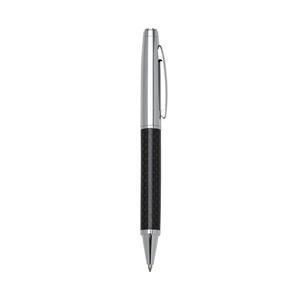 Descrição: Caneta metálica com acabamento brilhante, versões em couro sintético e fibra preta. Carga esferográfica azul e acionamento por rotação.