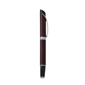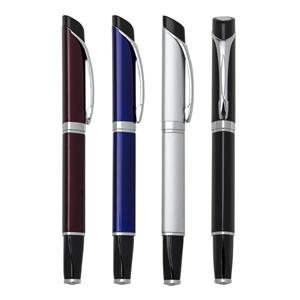 Descrição: Caneta metálica triangular com tampa, carga esferográfica azul.