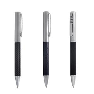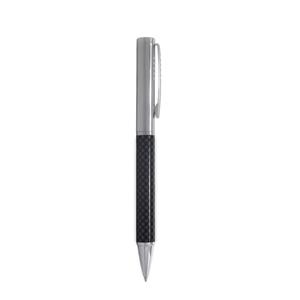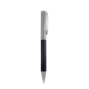 Descrição: Caneta metálica com carga esferográfica azul e acionamento por rotação.