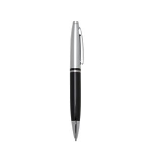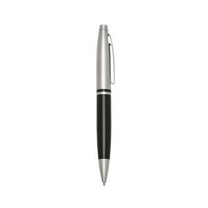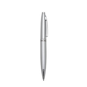 Descrição: Caneta metálica com carga esferográfica azul e acionamento por rotação.