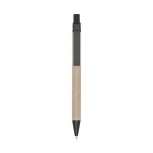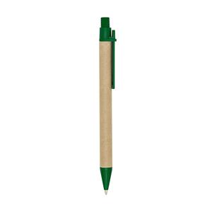 Descrição: Caneta de papelão com detalhes plásticos, carga esferográfica azul e acionamento por clique.
